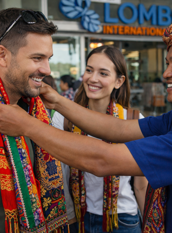 - Pengalungan selendang khas Lombok saat penjemputan